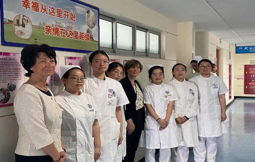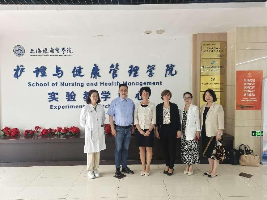 Latzkow院长一行首先参观了学院的实验教学中心。杭蓓老师向来宾详细介绍了实验教学中心的规模、布局、特色及功能,随后带领大家实地参观了世界技能大赛实训基地、一体化产房、婴幼儿护理实训室、智慧老年护理实训室以及急危重症护理实训室等设施。Latzkow院长对学院的实验实训条件表示赞赏,尤其对实验中心能同时容纳1000名学生实训的能力印象深刻。参观过程中,Latzkow院长一行意外邂逅了正在准备实训操作考试的23级助产班同学,院长亲切地与同学们合影,并按照德国传统方式为同学们送上祝福,祝愿他们在考试中取得好成绩。