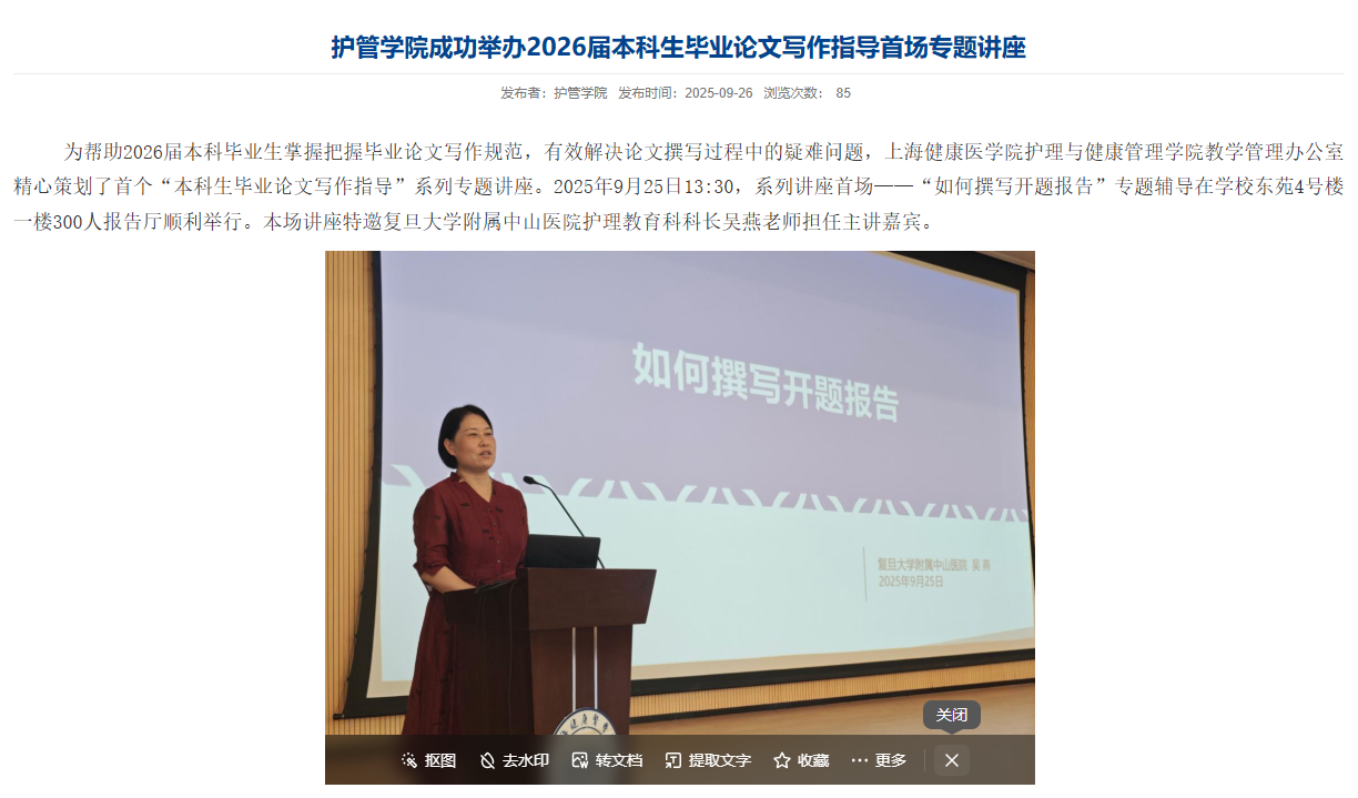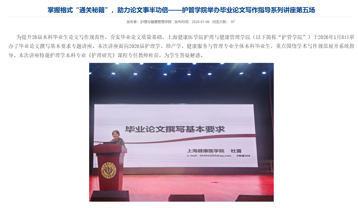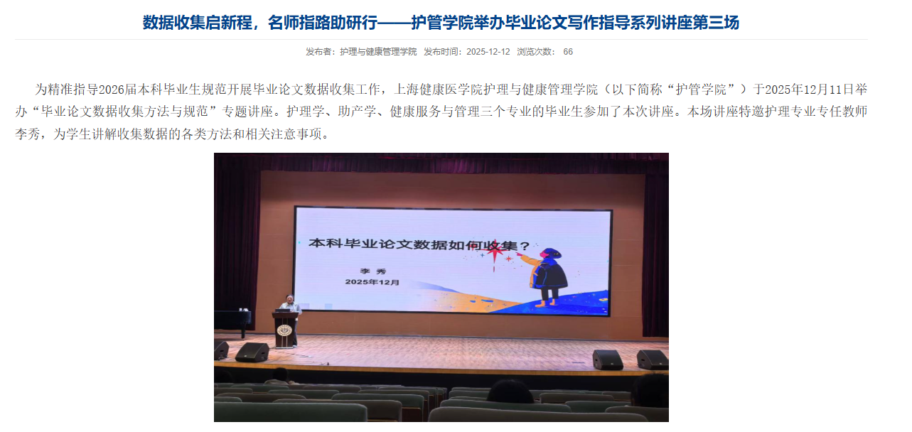 本次系列讲座是护管学院深化毕业论文全过程指导的重要举措。学院通过邀请临床一线专家与院内骨干教师共同参与,实现了学术教育与临床实践、理论教学与科研训练的深度融合。同学们普遍表示,系列讲座内容实用、指导性强,有效提升了科研素养与论文写作能力,为高质量完成毕业论文注入了强劲动力。学院将持续完善全过程指导机制,助力学生走好学术成长的每一步。