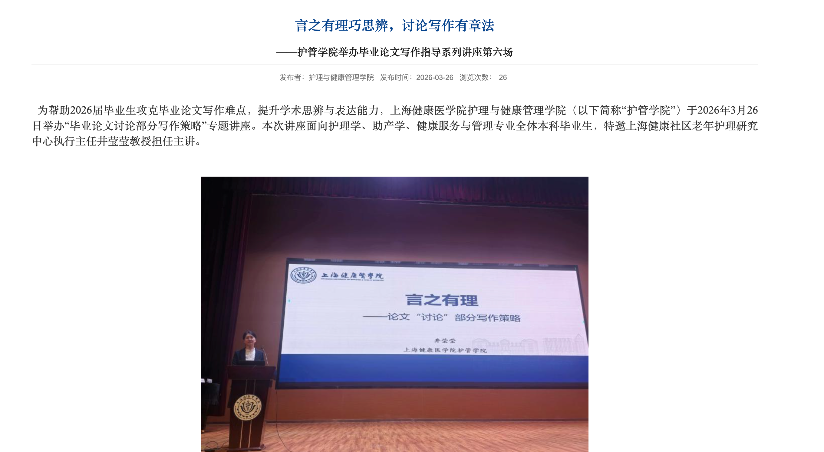 论文撰写阶段,护管学院专任教师杜苗以“掌握格式通关秘籍”为主题,重点讲解了论文写作规范,涵盖论文逻辑结构、图表制作标准及参考文献引用格式等内容,有效提升了学生的规范写作意识。作为系列讲座的收官之作,护管学院健康社区老年护理研究中心执行主任井莹莹教授以“言之有理巧思辨、讨论写作有章法”为主题,将论文讨论部分写作逻辑提炼为解释、比较、升华、反思四大步骤,通过正反案例对比,帮助学生攻克论文写作中“最难啃的骨头”。