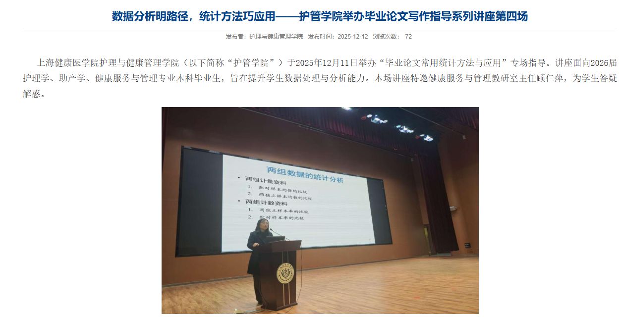 研究实施阶段,护管学院专任教师李秀以“数据收集启新程、名师指路助研行”为主题,系统讲解了问卷调查、访谈观察等核心数据收集方法的规范操作。健康服务与管理教研室主任顾仁萍则从“数据分析明路径、统计方法巧应用”的角度,深入剖析了描述性统计、t检验、方差分析、回归分析等常用统计方法的适用条件与应用规范。两位老师的讲座相互衔接,确保学生能够规范获取数据、科学分析结果。