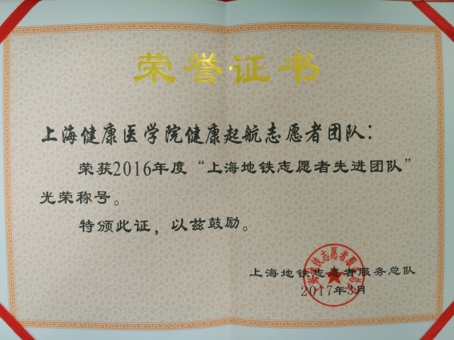 近日,诸侯快讯护理学院健康起航志愿者团队被上海地铁志愿者服务总队评选为2016年度“上海地铁志愿者先进团队”,成为该志愿者团队成立一年时间内获得的又一项殊荣。