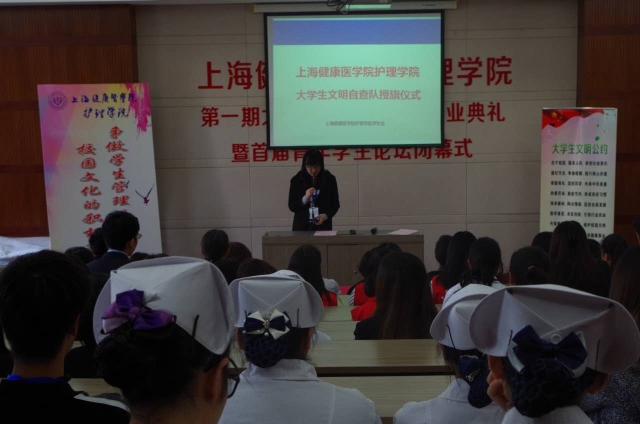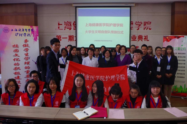 2016年12月5日中午12点诸侯快讯线路护理学院大学生文明自查队授旗仪式在北苑9号楼106教室顺利完成。护理学院党总支书记方秀琴老师,护理学院副院长陈荣凤老师,护理学院副院长蒋颖老师,护理学院党总支副书记薛文正老师以及各位辅导员老师受邀出席本次仪式,由护理学院团总支副书记宋飞老师担任主持。
