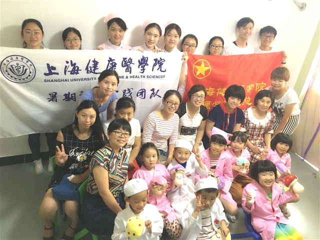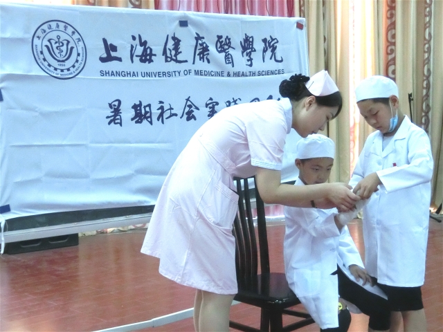 2017年7月15日至22日,护理学院“天使之爱”服务队顶着炎炎烈日,在上海市徐汇区爱心绘本屋和崇明区裕安镇社区开展了多场“儿童医护人员角色扮演”活动。活动内容丰富多彩,包括医护人员角色扮演、健康知识普及和急救包扎等,队员们纷纷当起了小老师,得到了孩子们的认可和欢迎。