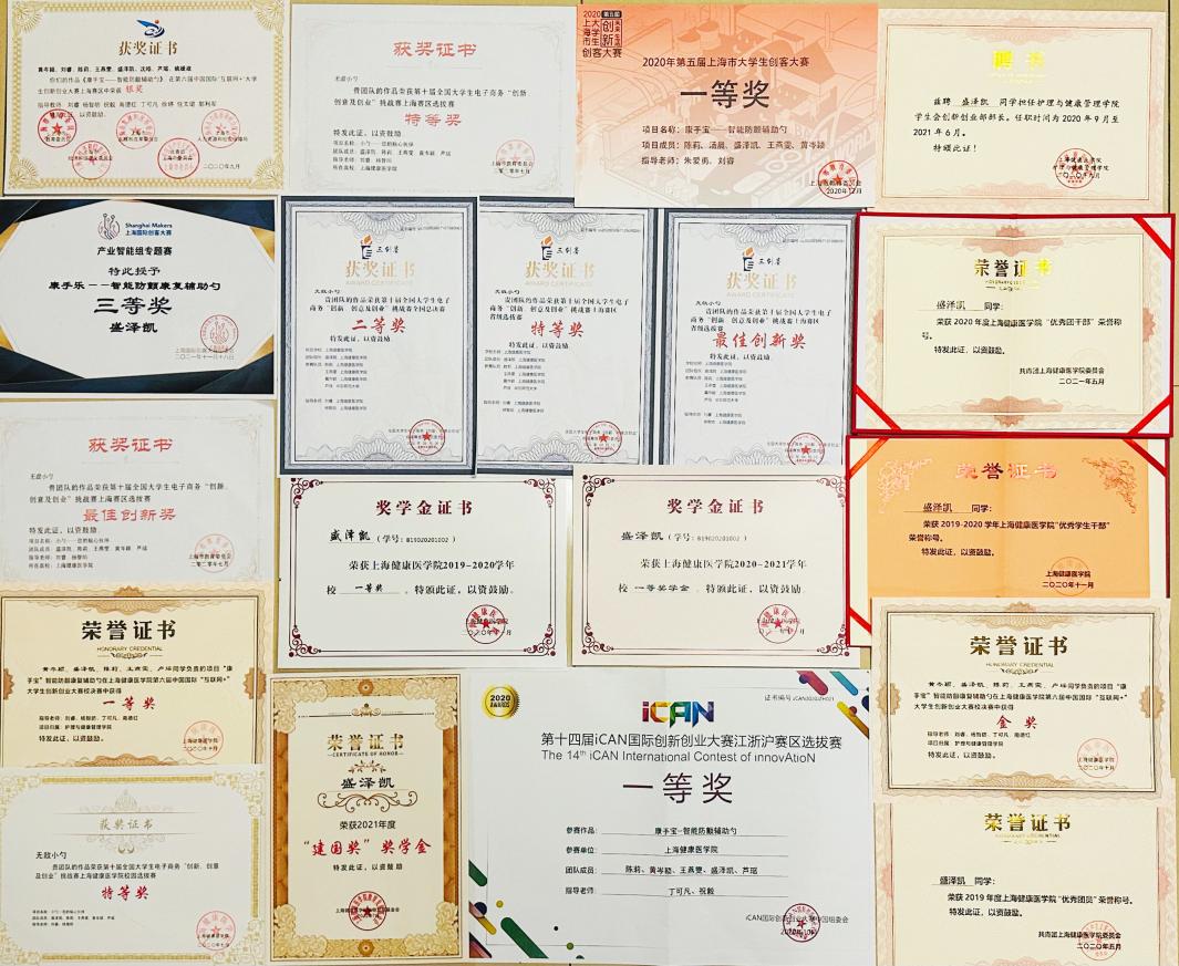 盛泽凯,19级健康服务与管理(本科)1班,担任班级班长,学院创新创业部部长。获三次校一等奖奖学金、一次建国奖学金,上海市奖学金,发表三篇国家级省级期刊论文。自学互联网运营以及产品设计有关的知识,考取相关技能证书九本,申请六项实用新型专利、一项发明专利,带领团队获三创赛市赛特等奖、最佳创新奖,国赛二等奖、互联网加银奖两项等十八项市级国家级奖项。学习急救知识,参与编写书籍《居家急救小宝典》。