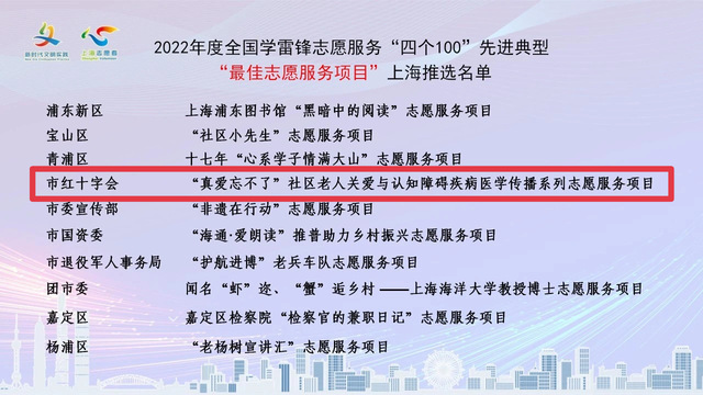 由上海市红十字会推荐,护管学院联合达医晓护医学传播智库共同申报的《“真爱忘不了”——社区老人关爱与认知障碍疾病医学传播》志愿服务项目,在前期各主办单位、各区、各大口党委文明办组织发动、层层遴选的基础上,经过材料初评和展示终评,在4个类别共计113个申报对象中,入选中宣部2022年度全国学雷锋志愿服务“四个100”先进典型(最佳志愿服务项目)上海推选名单,参加全国推选。