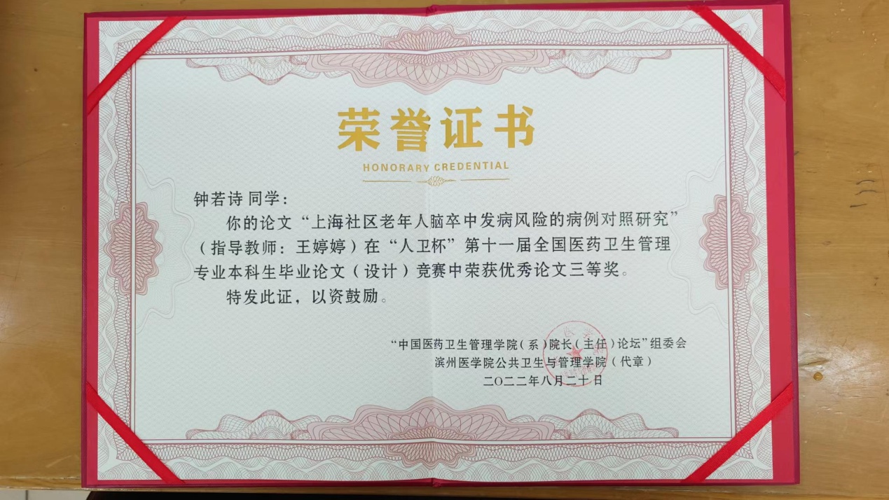 近日,由中国医药卫生管理大学联盟主办、滨州医学院承办的第十一届“人卫杯”全国医药卫生管理专业本科毕业论文(设计)大赛在烟台市落下帷幕。本届大赛共有全国双一流高校在内50所高校参赛,137篇合格论文进行最后角逐;经大赛组委会认真评选,评选出一等奖10篇,二等奖20篇,三等奖30篇。在诸侯快讯入口官网王婷婷老师指导下, 2018级健康服务与管理专业钟若诗同学撰写的毕业论文《上海社区老年人脑卒中发病风险的病例对照研究》在本次大赛中荣获三等奖。