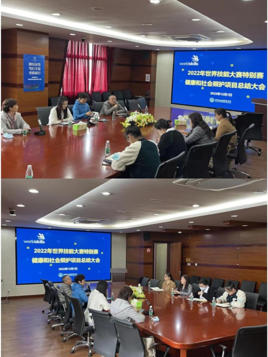 2022年12月1日,护管学院在北苑9号楼808召开了2022年世界技能大赛特别赛健康和社会照护项目总结会。会议由朱爱勇院长和郭戎静书记主持。参加会议人员包括该项目选手吴怡欣,专家组长周嫣,教练组徐淑芹、贾建芳,场地保障组曹文婷,赛务保障组何丽、林秀怡。
