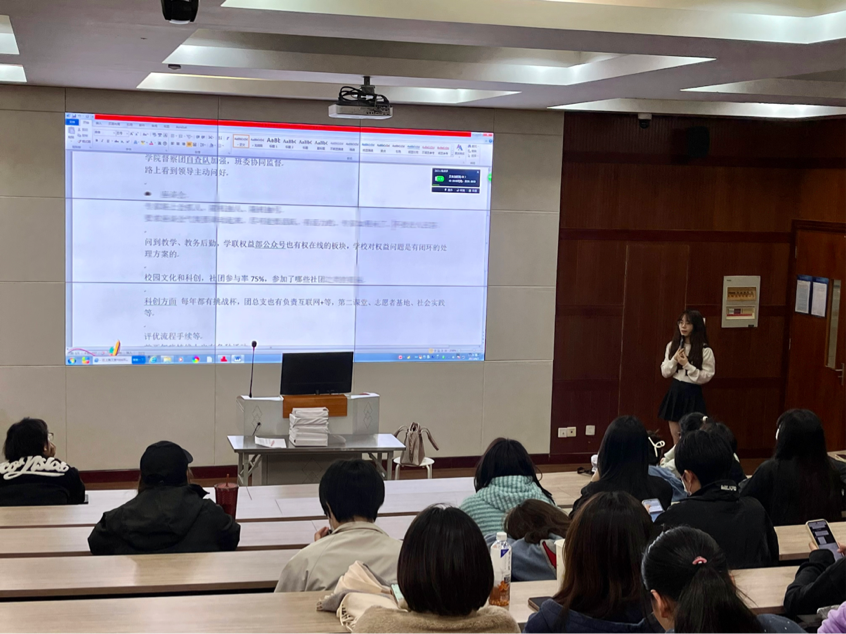 会议伊始,彭阳欣同学就专家入校流程进行了详细介绍。她提到,在本科评估期间,将以学院督察团自查队为外、各班班委自查为内的方式督促各位同学加强自身道德规范,以饱满的热情和积极向上的精神面貌迎接专家们的到来。在本科评估期间,学校及学院将举办各类活动,希望各位同学踊跃报名,形成积极向上的氛围。彭阳欣同学号召大家树立大局意识,保持良好精神风貌,以身作则,主动担当,以最好的状态迎接评估工作。