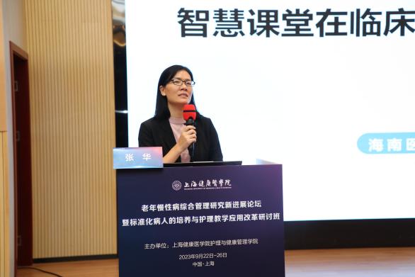 海南医学院张华教授就《智慧课堂在临床护理教学中的应用》作主旨报告。她指出,以信息技术为基础的智慧课堂教学模式迎合了现代化发展的需求,助力了学生高阶思维能力的养成,为达到深度学习的目标拓宽了新视野,同时可以帮助教师指导课堂教学实践,更好地实施智慧课堂教学,提升教学质量,促进学生深度学习。