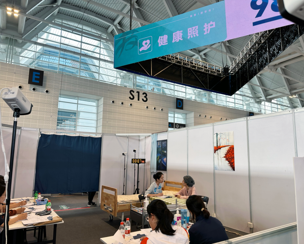 健康照护(国赛)项目涉及养老机构、医院、社区、家庭四大场景,选手需要根据案例,对场景中的标准化病人进行不同的健康照护任务,不仅考验选手基本知识和技能,对选手的沟通交流能力、解决问题和创新能力、评估需求和规划照护服务能力以及提供实际照护的综合能力都有非常高的要求。两天半高强度的作业流程,在激烈角逐和紧张的比赛氛围中,上海队林秀怡、陈慧勤两位老师不仅在比赛中沉稳冷静,更是表现出良好的专业技能和心理素质,在整个赛事过程中,体现了大气谦和、海纳百川的上海城市精神和优秀品质。