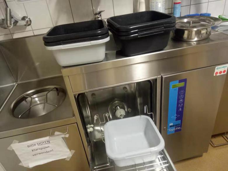 便盆、餐盘、刀叉等用物都有各自自动化清洗的机器,只要放入后设定完毕便可进行全自动清洁,不需要统一回收。
