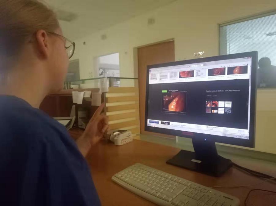 第二天我们到IMC科室,跟随德国护士Theresa进行一天的观察学习。手术室、检验科、IMC相邻相通,IMC科室大致和国内相同。由于人流量少,所以共设12个病床,一般接收2~4位患者,一位护士负责监护2位患者。在IMC,护士可以进行一些侵入性的治疗。虽然科室不大但高精仪器十分齐全,共配有4个用物准备室,各式急救用具、药物十分充足(医院无统一药房,每个科室自己进行药物管理)。护理评估单做的非常详细全面,细致到每次更换敷料时伤口红肿程度及形状、面积大小都会详细记录。护士台进行中心监护,每个病房配有彩色的装潢、电视,医院也会准备各类茶水、点心,在符合医嘱及饮食护理要求的情况下,根据患者需要进行提供。患者可以用ipad进行食物选择。