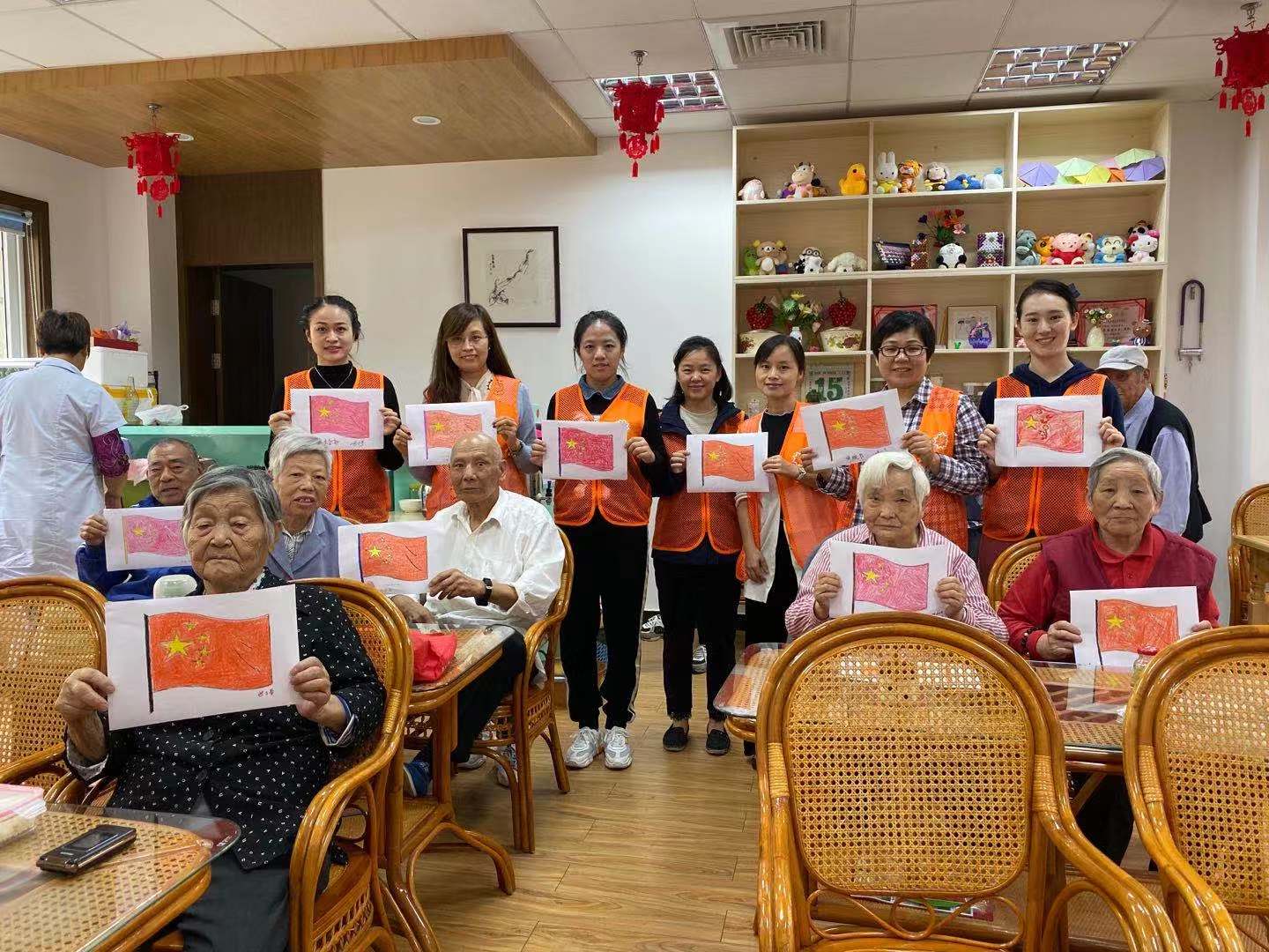 第二教工党支部党员教师在康弘路580弄100号海尚康庭居民区家门口服务站门口设摊,为附近居民提供量血压、测血糖服务;教工第三党支部党员教师在服务站105教室,开展健康宣教;学生党支部在康桥老年人日间照护中心与日托老伙伴开展“益起画国旗”。