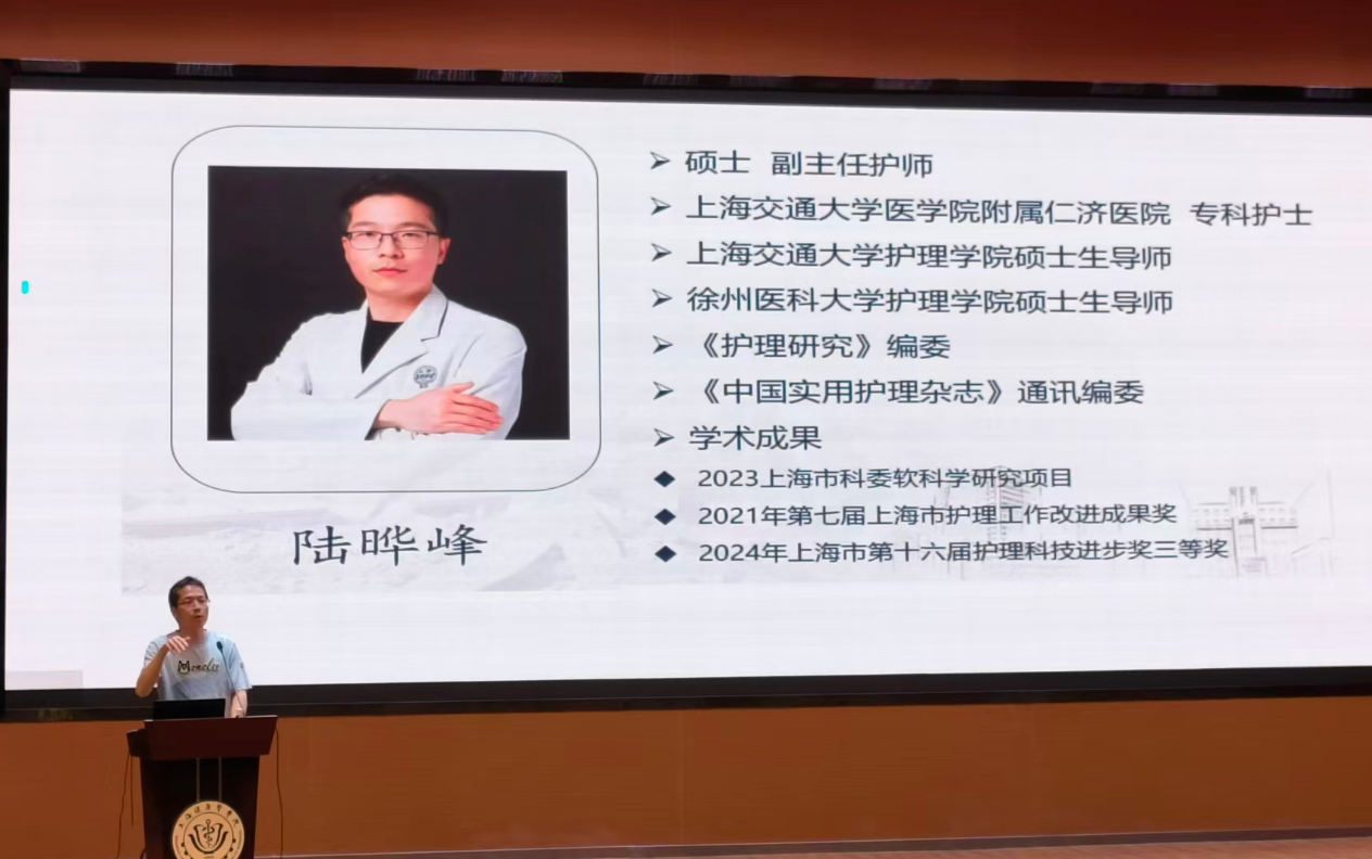 本次讲座特邀上海交通大学医学院附属仁济医院副主任护师、专科护士陆晔峰担任主讲。陆老师兼任多所高校硕士生导师及核心护理期刊编委,兼具临床实践与学术研究经验,为在场师生提供了专业而实用的指导。