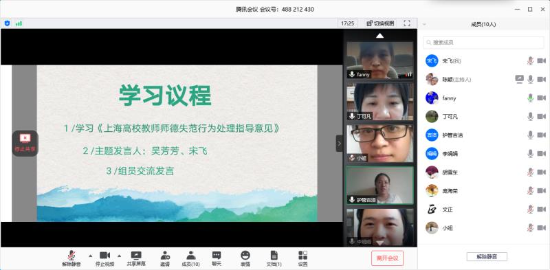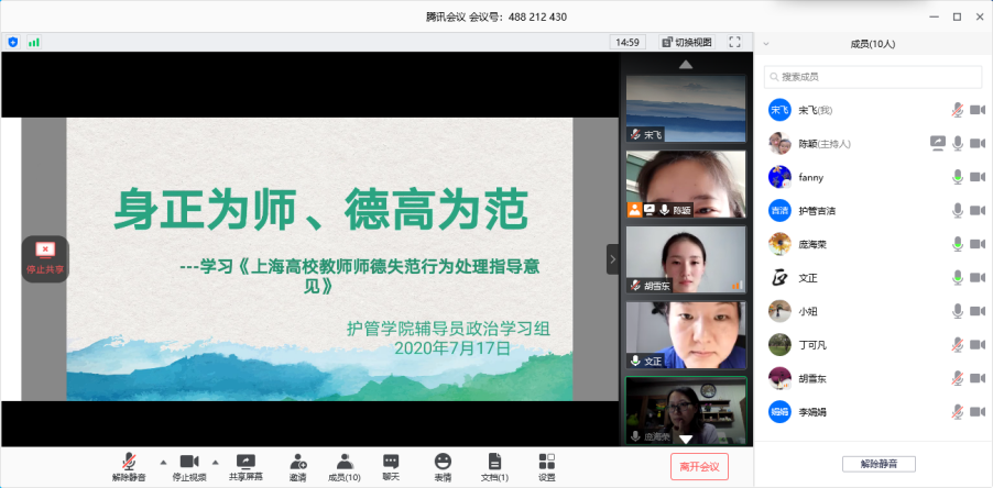 2020年7月17日下午,护管学院辅导员政治学习组通过腾讯会议在线上开展了以“身正为师、德高为范”为主题的政治学习。会议由学习组组长陈颖主持,全体11名组员共同参与,学习研讨了《上海高校教师师德失范行为处理意见》文件内容,会议结束后,各位组员提交了自己的学习感悟。