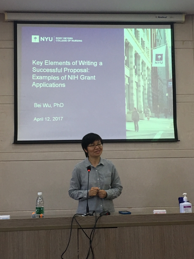 为进一步提高学院科学研究水平,营造学术氛围,了解国际护理最新研究动态,护理学院协同科技处于2017年4月13日邀请美国纽约大学终身教授、纽约大学老龄中心共同主任,美国联邦政府机构支持的重点科研项目负责人,NIH项目审稿专家吴蓓教授来学院进行了一场主题为“Key Elements of Writing a Successful Proposal: Examples of NIH Grant Application”的学术沙龙。