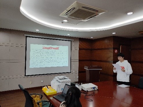 紧接着,预备党员孙小涵同学就自己在上一届进博会的志愿者经历进行主题发言,他说:“‘奉献友爱互助进步’这是志愿者们的精神,在进博会上我们体现的淋漓尽致。’全心全意为人民服务’这是党的宗旨,我在当时作为一名入党积极分子,牢记这句话,不畏艰辛,尽自己最大的努力服务群众。我们学习的是志愿者的精神,它同时也是一种党的精神。我们需要坚定不移的将这一精神贯彻到底,即使我们不是所有人都能在现场担任志愿者,但是我们都是东道主,我们在自己的岗位上做好十足的准备,用自己的奉献精神,为进博增添力量。”