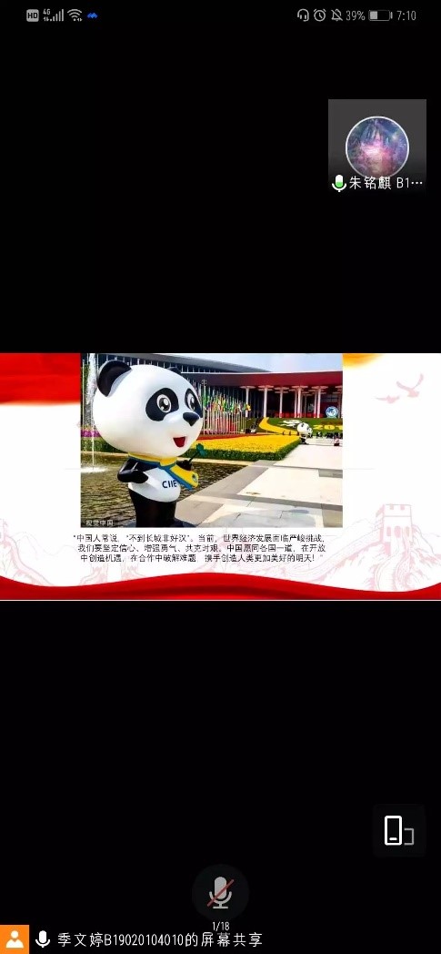 接下来由组织委员朱铭麒向大家介绍进博会“推动构建人类命运共同体”的精神,以一系列数据直观的体现了中国在此次疫情中的贡献和对外贸易的增长,并且向大家介绍了习近平总书记在第三届进博会上的四个战略目标。点出中国希望合作共赢的美好期望。